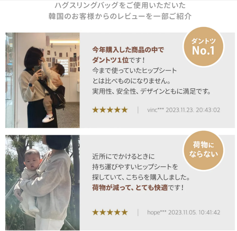 ※本商品は元々韓国で開発され、「5万人のママに選ばれた」ほど人気を博したモデルです。日本ではKnK社が輸入販売を手掛け、クラウドファンディングサイト「Makuake」でプロジェクトを成功させた実績もあります。さらに2025年ママリ口コミ大賞グッドデザイン賞を受賞し、楽天市場ヒップシート部門でも売上No.1を記録するなど、その実力は折り紙付きです。