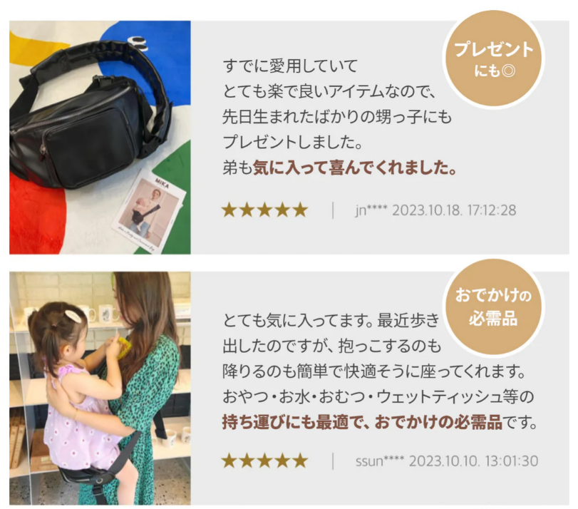良い口コミでは、「荷物と抱っこが一つになって本当にいい!」「肩が楽になり、子どももすぐ寝てくれた」といった喜びの声が目立ちました。特に携帯性と手軽さ、デザイン性に関する評価が高く、購入者の満足度は総じて高いです。