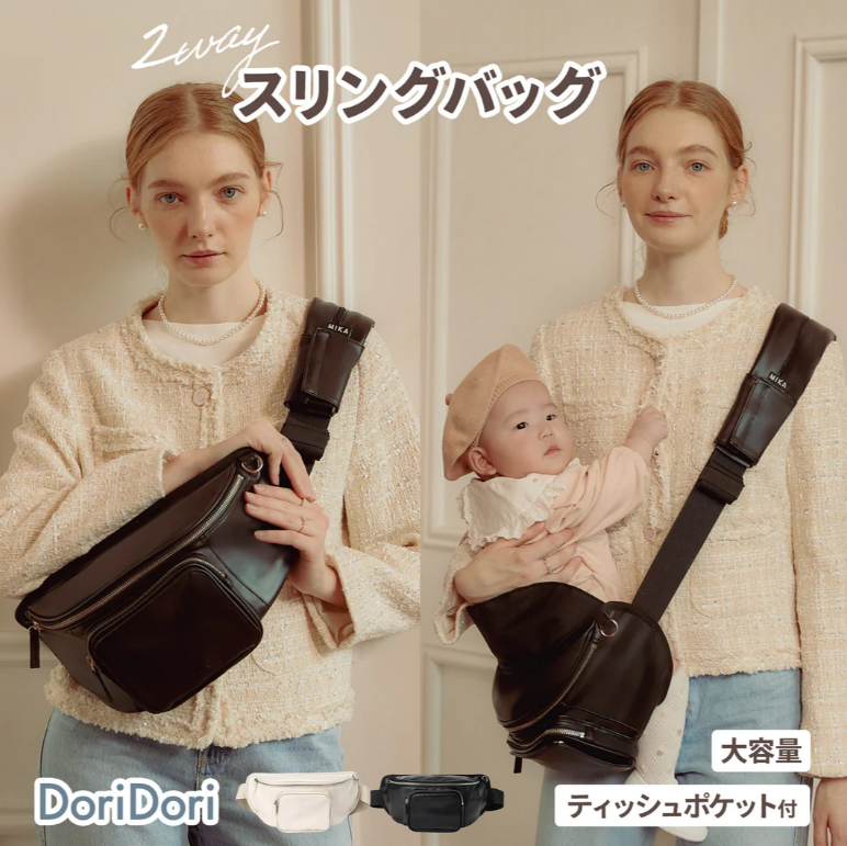 抱っこ紐をつける程ではないが抱っこするのがつらい時に簡単に抱っこできて、腱鞘炎の痛みも楽になりました。【…】子どもを抱っこしていなくてもボディバッグとして身につけていておしゃれ…抱っこしたまま荷物の出し入れは少ししにくいですが問題ないです。<doridori.co.jpdoridori.co.jp より>