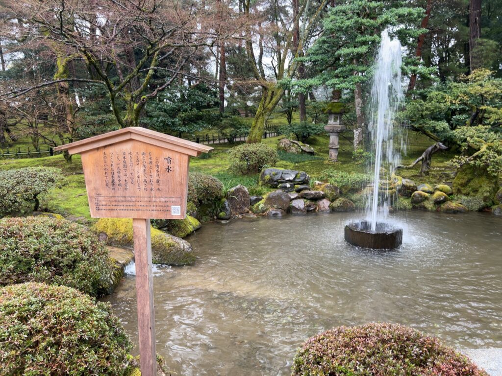 多くの方が「日本で最もすばらしい」とされる兼六園の噴水に目を奪われるでしょう。これは電気や機械で動いていません。高低差を生かした仕組みの噴水です。この噴水のわきの水が静かに流れ落ちる音は、心地よいBGMとなり、心を落ち着かせてくれます。特に、朝の清々しい空気の中で耳を澄ませてみてください。